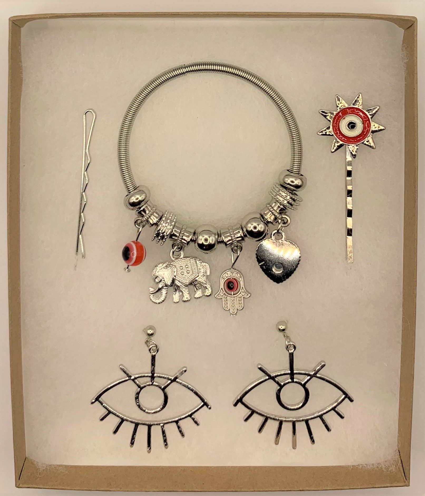 Be the first to review “Evil Eyes Hand Hamsa Elephant and Heart Bracelet 3pcs Set with Earrings and Hair Pins (D2)” Cancel reply
