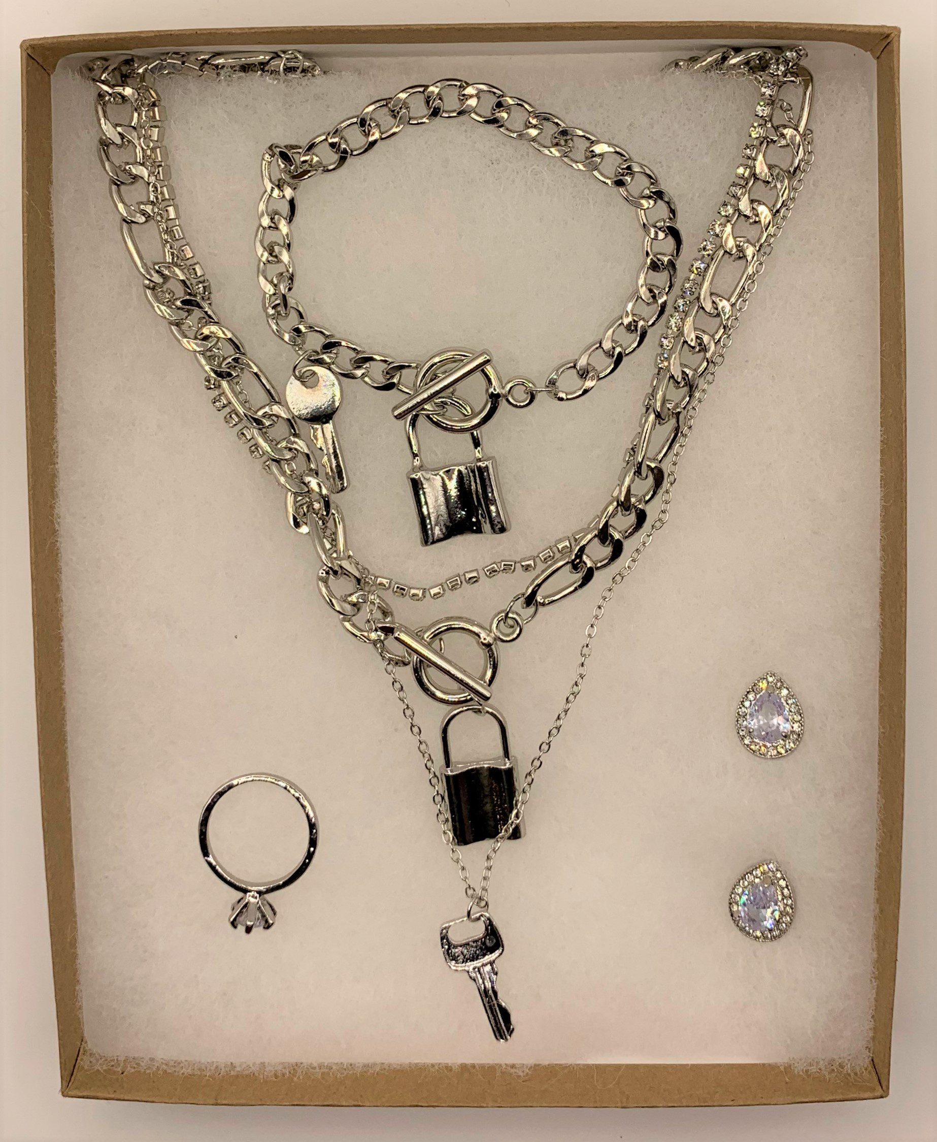 Lock and Key Three Layered Necklace 4pcs Set with Bracelet, Earring and Free Ring (D6)