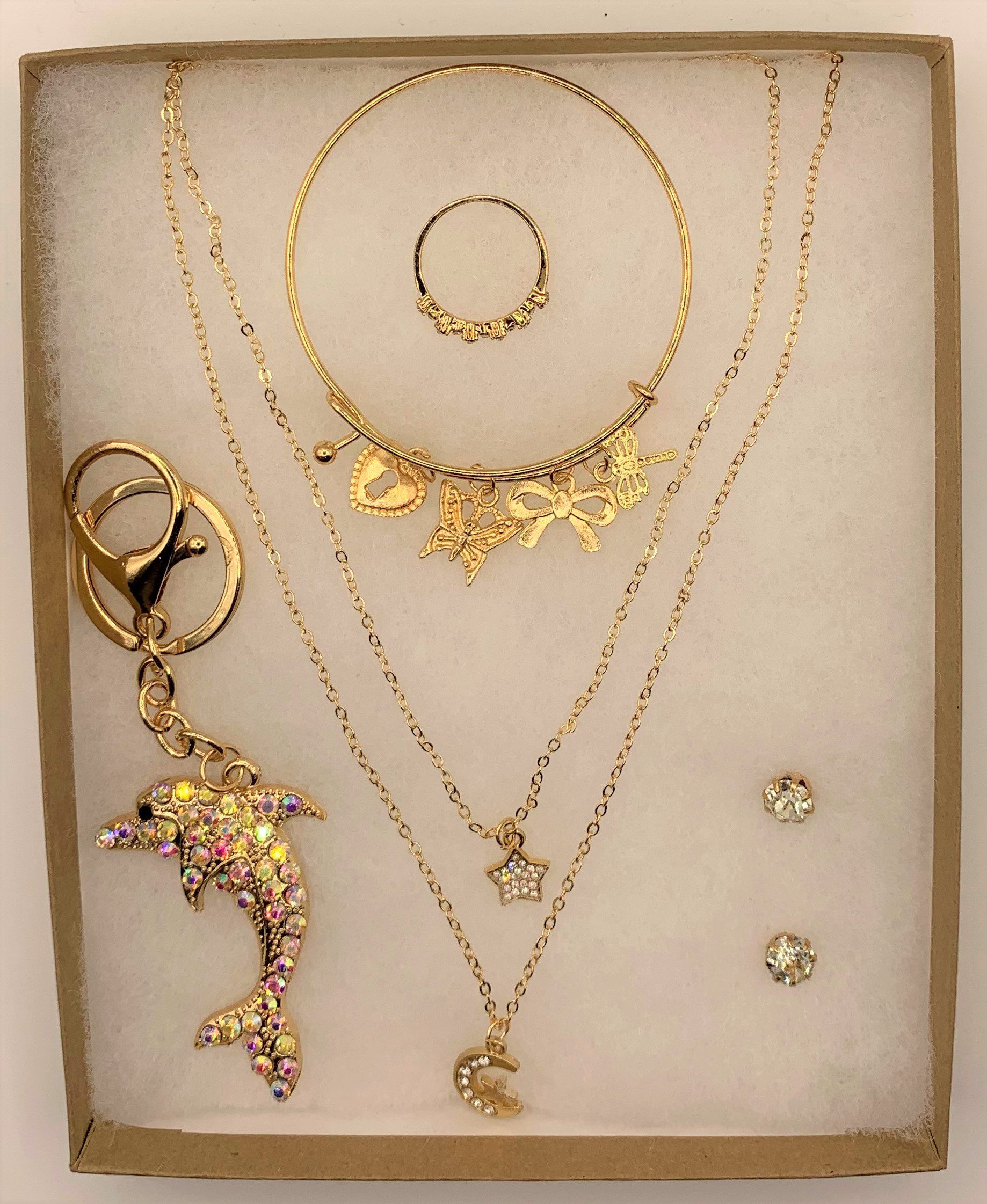 Moon and Star Necklace 5pcs Set with Bracelet, Earring, Key Chain and Free Ring (D9)